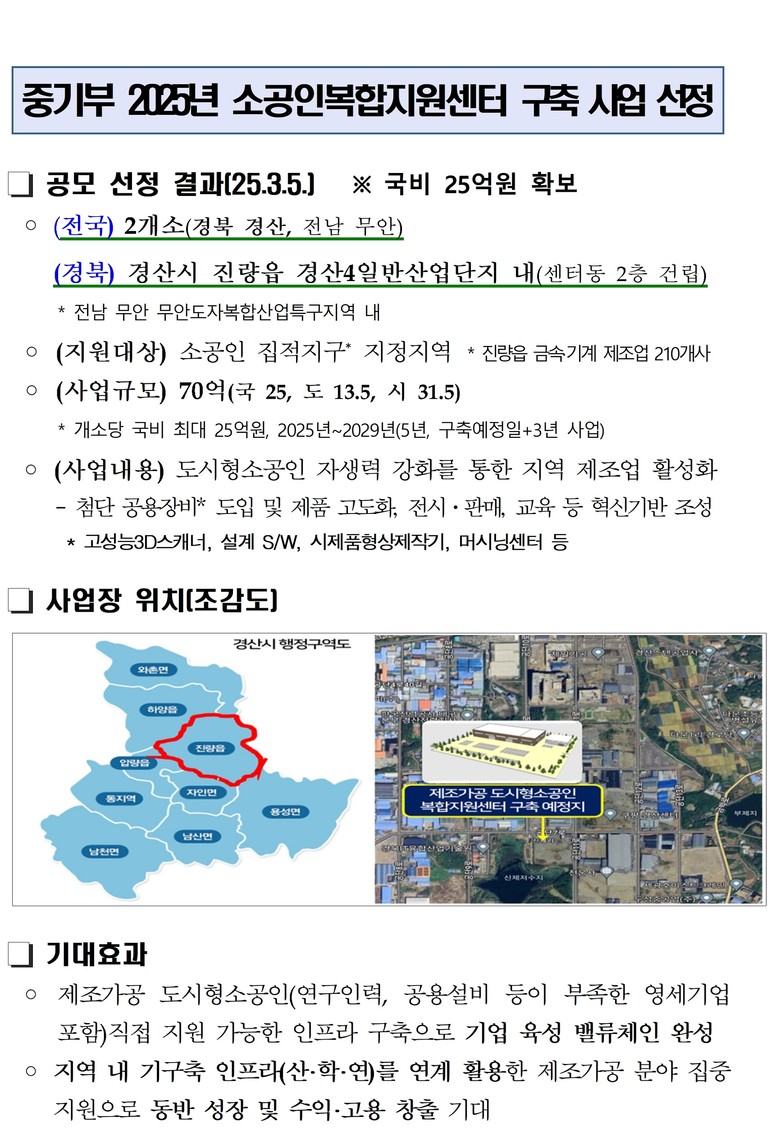 센터 조성 예정지는 경산시 진량읍 일반산업단지로서, 금속 가공제품·기계 및 장비 제조업 210여 개사가 집적화되어 있다. 산·학·연 협력이 가능한 소공인 제조 창업의 최적지로 지역경제 활성화와 신규 고용 창출이 기대된다.