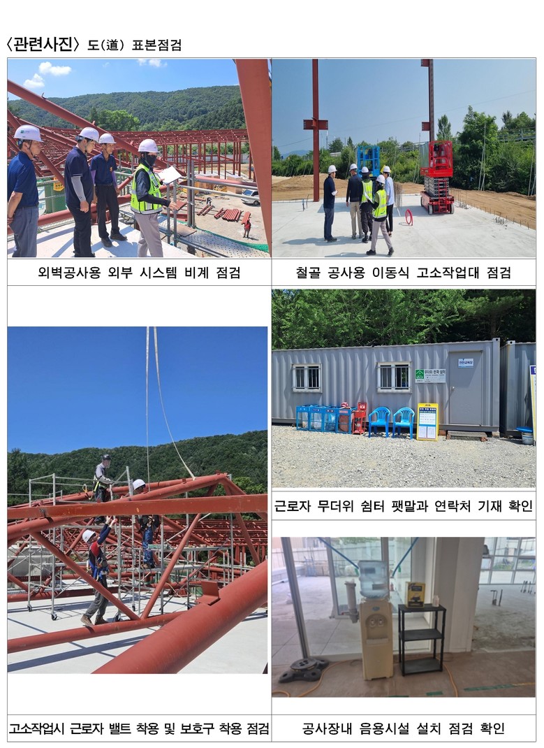 이번 점검은 공사비 50억 원 이하 중소형 건축공사장 중 폭염에 취약한 6개소를 표본 선정하여, 강원자치도와 한국산업안전보건공단, 시군이 합동으로 온열질환 예방수칙 이행 여부 및 안전관리 실태를 점검하고, 총 30건의 미흡 사항에 대해 현장 안전조치를 완료했다.