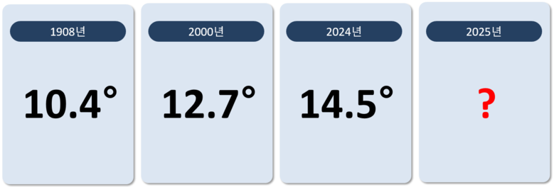 우리나라가 근대식 기상 관측을 시작한 1908년에 10.4도였던 서울의 평균기온은 2024년에는 14.5도를 기록하여 그 사이 4.1도가 상승했다.