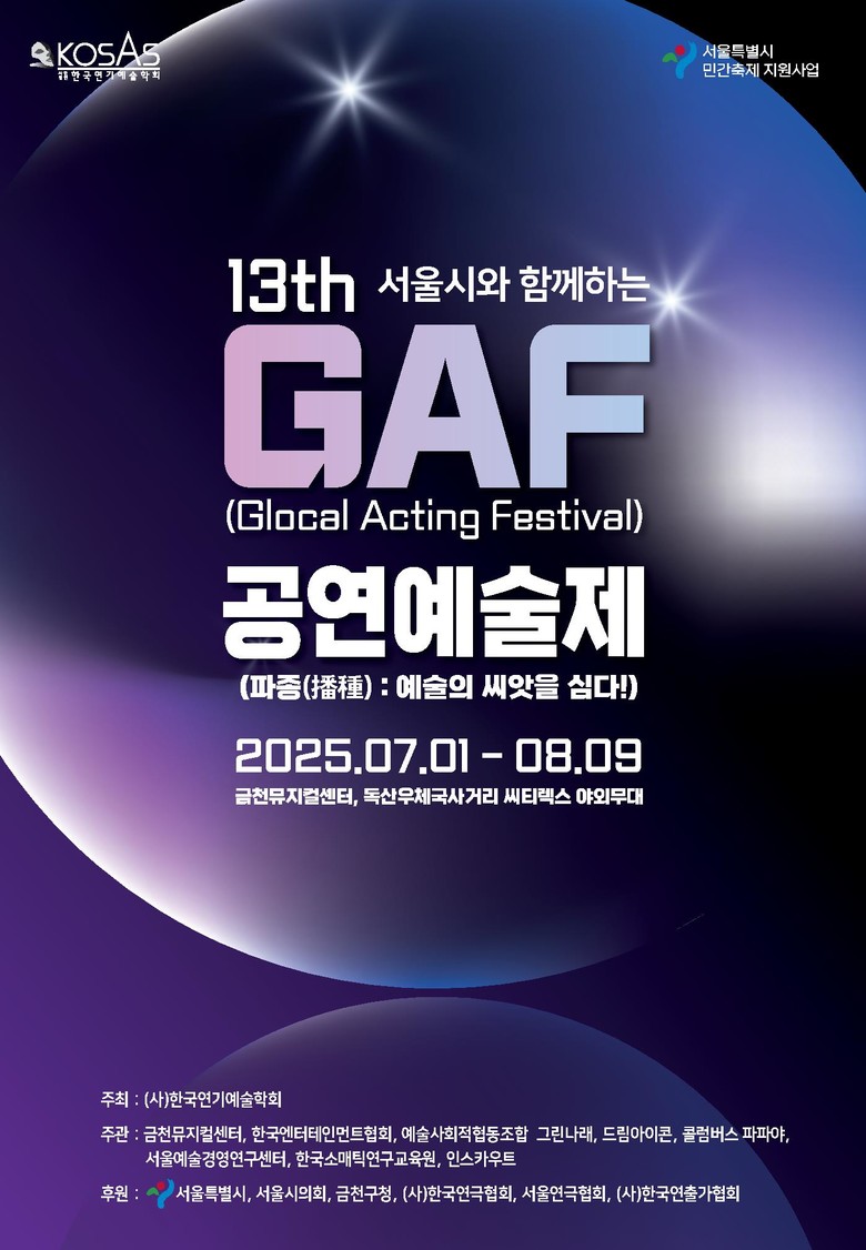[서울 세계타임즈=이장성 기자] 올해 13년째 개최하는 대중과 함께하는 예술인의 축제 “제13회 GAF(Glocal Acting Festival) 공연예술제(파종(播種) : 예술의 씨앗을 심다!)” 가 7월 1일 개막식을 시작으로 8월 9일까지, 총 39일간의 행사로 이어진다.