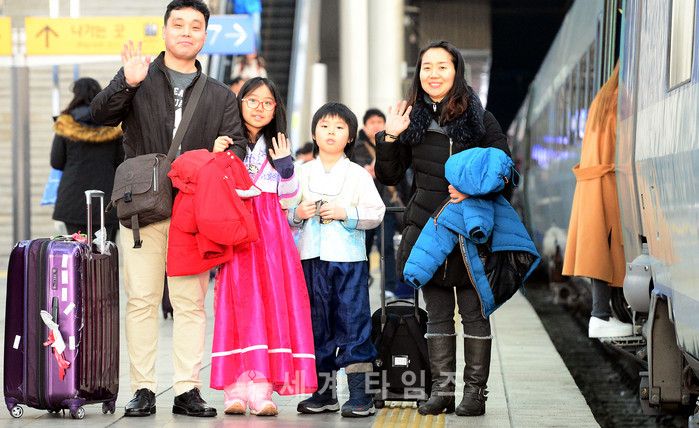 26일 설을 앞두고 서울역에서 한복을 차려 입은 한가족이 기차를 타고 고향으로 떠나기전 손을 흔들고 있다. 2017.01.26.