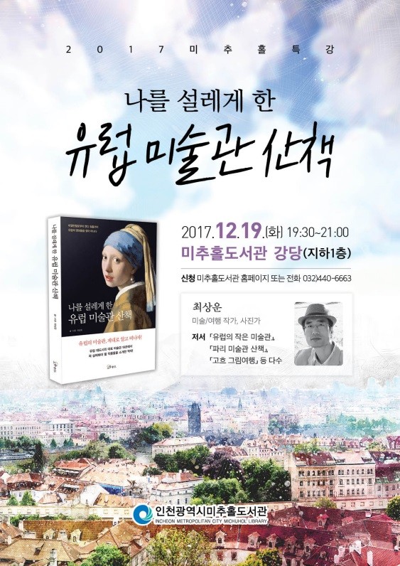 최상운 작가 강연회 ‘나를 설레게 한 유럽 미술관 산책’은 무료로 사전 신청을 통해 참여가 가능하며, 미추홀도서관 지하1층 강당에서 진행된다.