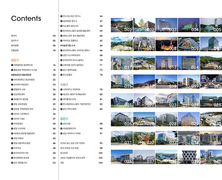 가이드북에는 성남시 건축상 수상작과 국내외 유명 건축가가 설계한 건축물 가운데 건축적·장소적 가치와 도시 발전의 의미를 지닌 40개소가 포함됐다. 선정 과정에는 성남시 건축위원회와 경관위원회 위원 등 건축 전문가들이 참여해 추천과 자문을 거쳐 최종 대상지를 확정했다.