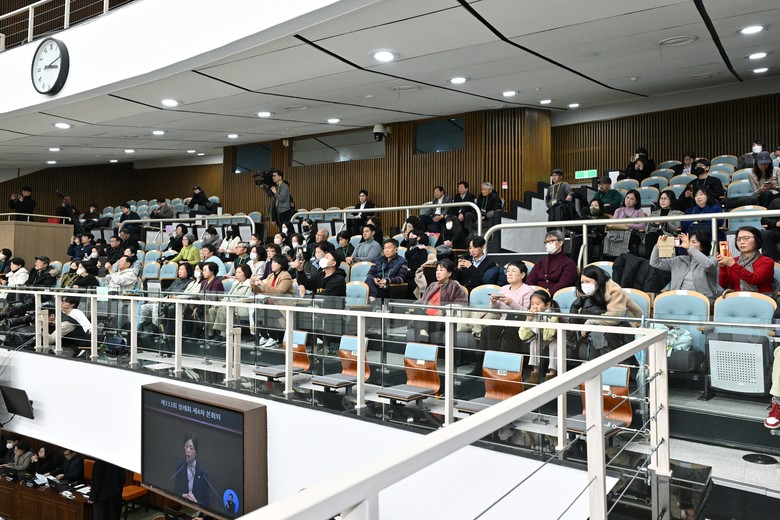 | ▲ 한남시범아파트 주민들이 최유희 의원의 자유발언을 듣기 위해 서울시의회 본회의를 방청하고 있다. |