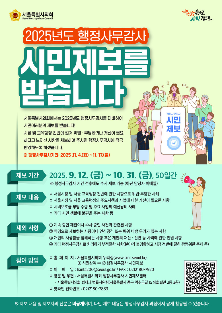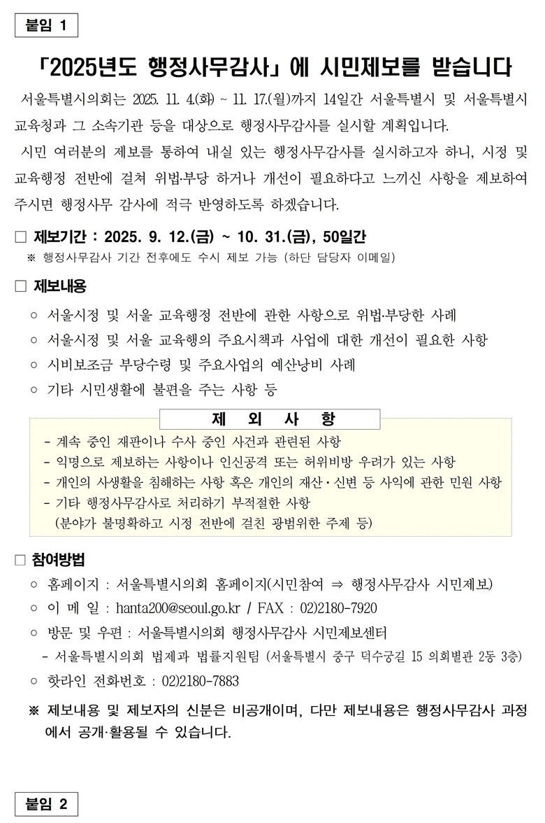 이번 시민제보는 서울시민과의 소통을 강화하고, 다양한 의견을 수렴하여 내실 있는 행정사무감사를 진행하기 위해 추진된다.