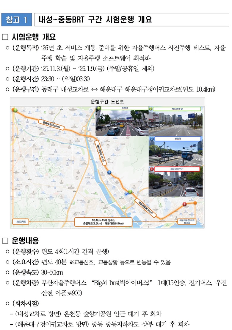 시는 이번 시험 운행을 통해 차량-사물 통신(V2X), 정밀지도 등 차량.도로 기반 시설(인프라) 간의 연동성 검증과 주행 안정성을 확인하여, 향후 부산 전역 자율주행 대중교통 서비스 확대의 기초자료로 활용할 예정이다.