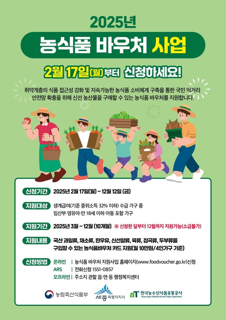바우처 신청은 오는 17일부터 온라인(www.foodvoucher.go.kr), 자동응답전화(ARS)(1551-0857), 방문 신청 등으로 가능하다.