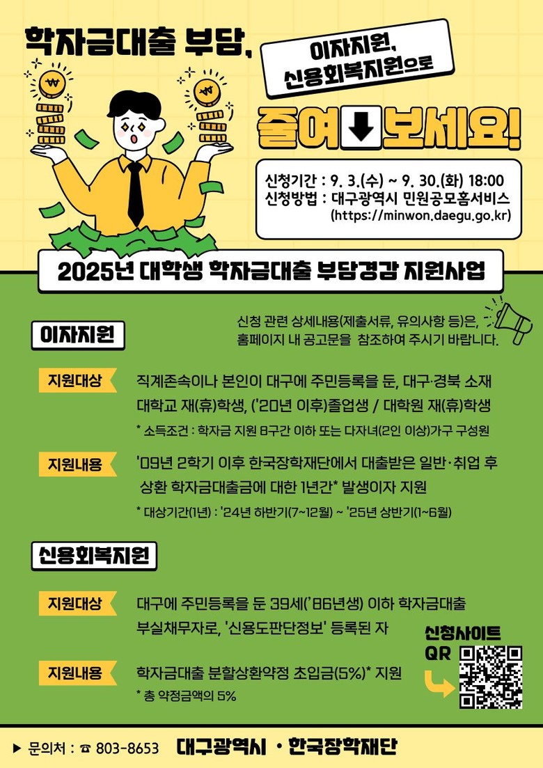 ▸ 지역대학생 경제적 부담 해소로 학업·취업 활동에 전념 기대 [대구 세계타임즈=한윤석 기자] 대구광역시는 지역 청년들이 경제적 부담을 덜고 학업과 취업에 전념할 수 있도록 ‘2025년 대학생 학자금대출 부담경감 지원사업’을 추진한다.