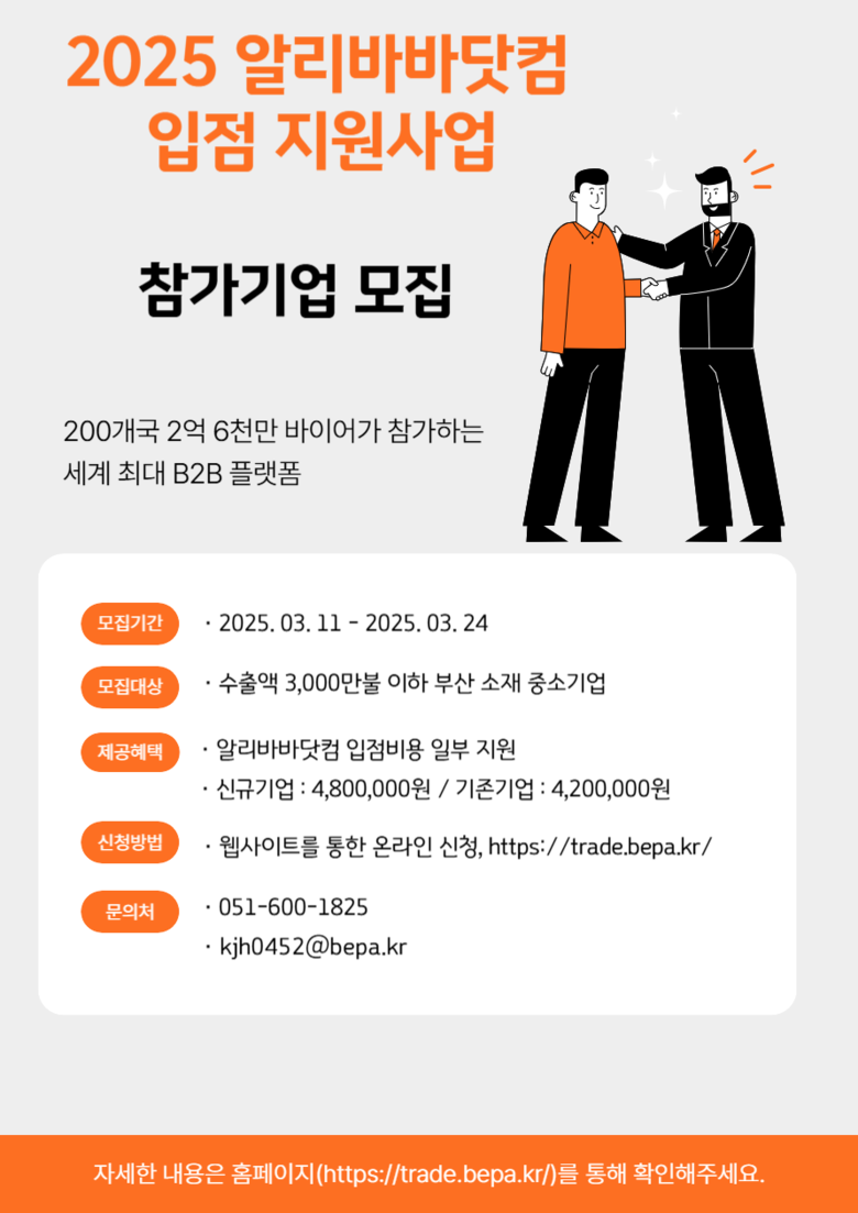 ◈ 참여 희망기업은 3.24.까지 시 해외마케팅 통합시스템을 통해 신청하면 돼 [부산 세계타임즈=이용우 기자] 부산시(시장 박형준)와 부산경제진흥원(원장 송복철)은 지역 중소기업의 세계(글로벌) 시장 진출을 지원하기 위해 세계 최대 기업 대 기업(B2B) 온라인 플랫폼인 '알리바바닷컴' 입점을 확대 지원한다고 밝혔다.