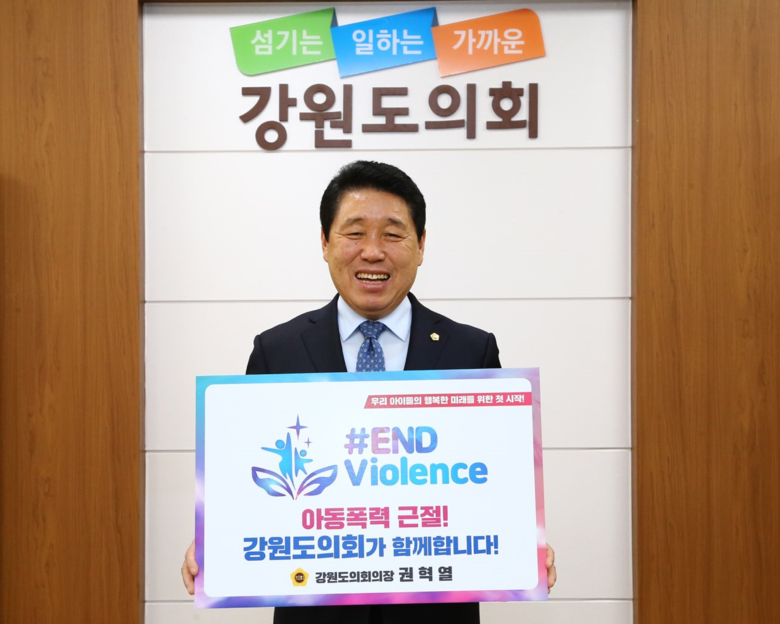 권혁열 강원도의회의장은 아이들의 행복한 미래를 위한 첫 시작은 아동폭력 근절임을 강조하며 “아이들이 폭력으로부터 안전하고, 차별받지 않고, 행복한 미래를 꿈꿀 수 있는 따뜻한 강원도를 만드는데 최선을 다하겠다”고 말했다.