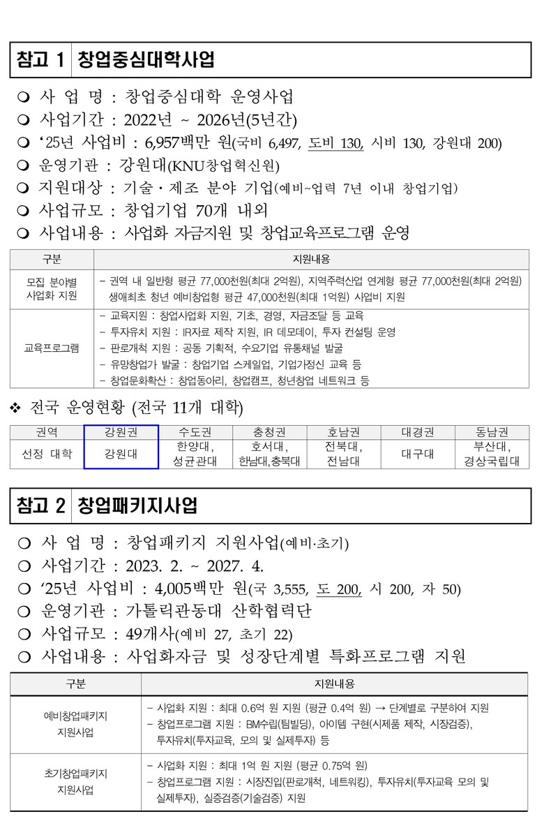 김만호 강원특별자치도 경제국장은 “도내 창업기업이 미래 기술 분야를 선도하기 위해서는 인재양성, 기술혁신과 연구지원, 산학협력의 중심지인 지역대학의 역할이 매우 중요하다”면서, “앞으로도 대학을 기반으로 한 창업 활성화와 지역 기반 창업기업 육성에 아낌없이 지원하겠다”고 밝혔다.