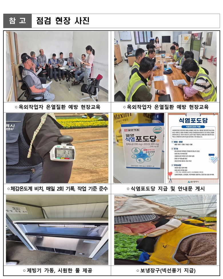 이번 점검은 폭염 시 근로자 건강을 보호하기 위한 선제적 조치로, 최근 개정된 산업안전보건법과 안전보건규칙 내용을 반영하고, 직업성질병 예방을 강화하기 위해 추진됐다.