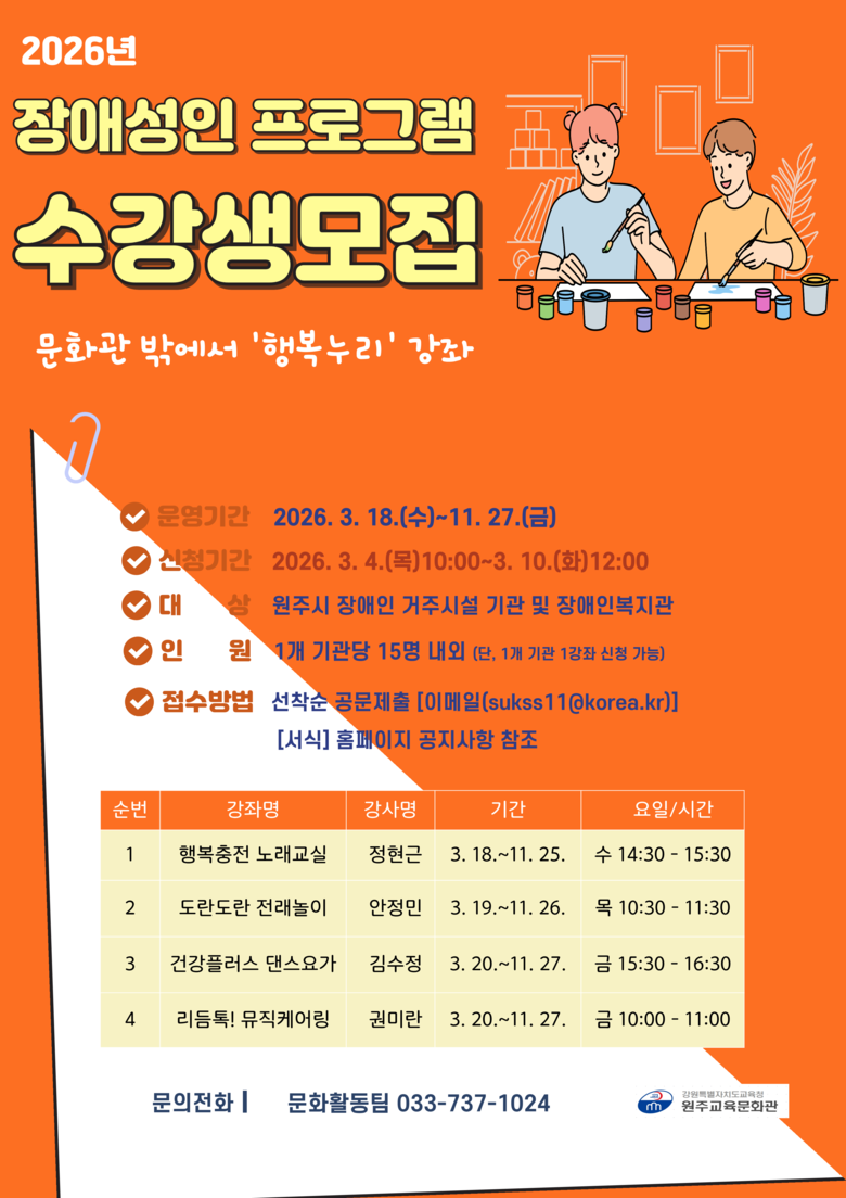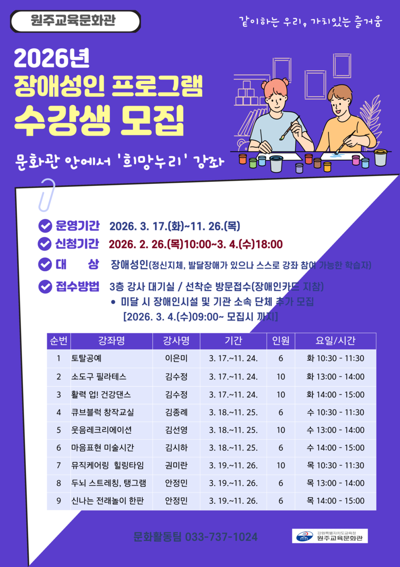 참가 신청은 2월 26일(목) 오전 10시부터 원주교육문화관 3층 강사대기실에서 가능하며, 신청 시 장애인카드를 지참해야 한다. 자세한 사항은 문헌정보과(☎ 737-1024)로 문의하면 된다.