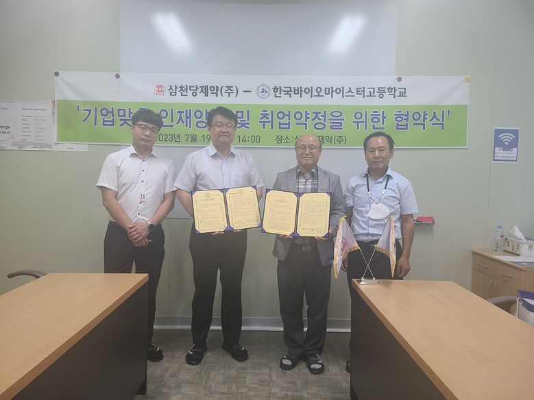 [충북 세계타임즈=이현진 기자] 한국바이오마이스터고등학교(교장 류영목)가 경기도 화성시에 위치한 삼천당제약(주)(대표이사 전인석)과 인재 육성 및 취업약정을 위한 산학협력을 체결하였다고 21일(금) 밝혔다.