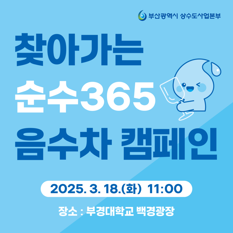 캠페인의 첫 시작은 이달 18일 부경대학교 캠퍼스 백경광장에서 오전 11시부터 약 3시간 동안 진행될 예정이며, 캠페인에는 ▲'순수365' 시음 체험 ▲미니퀴즈 게임 ▲시책 홍보 ▲각종 이벤트 등이 포함된다.