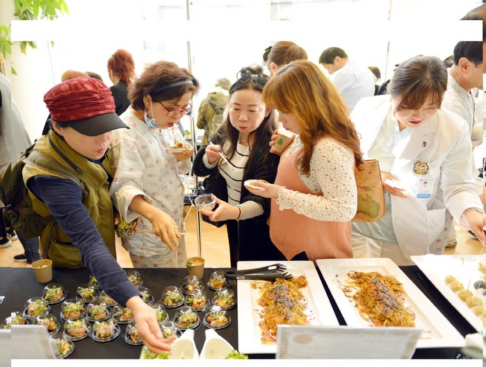 | ▲ 25일 열린 H+소화기병원 개원기념 ‘대장암예방 쿠킹테라피’ 에서 입원환자, 지역주민 들이 다양한 대장암예방 건강식 요리를 맛보고 있다. |