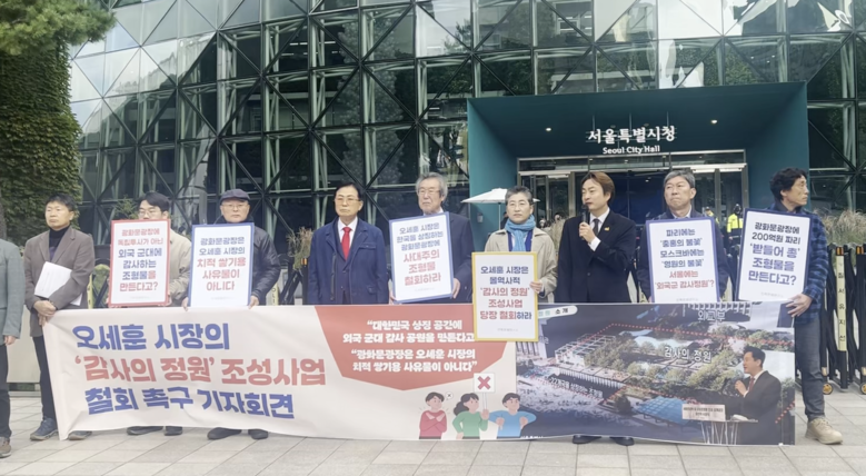 오세훈 시장이 추진 중인 이 사업은 6·25 참전국에 대한 감사의 뜻을 담는다며 세종대왕 동상 옆에 7m 높이의 ‘받들어 총’ 모양 돌기둥 22개를 세우고, 지하에는 ‘참전국과 실시간 소통’ 공간을 조성하는 계획이다. 총사업비는 약 500억 원 규모로 알려졌다.