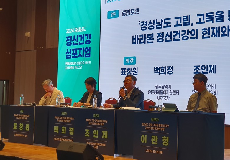 [경남 세계타임즈=최성룡 기자] 경상남도의회 문화복지위원회 조인제 도의원(국민의힘, 함안2)은 6월 20일, 경상남도와 경남광역정신건강복지센터가 주관한 ‘2024년 경상남도 정신건강 심포지엄’에 종합토론 패널로 참석해 도내 고립·은둔 청년 실태와 정책 과제를 발표했다.