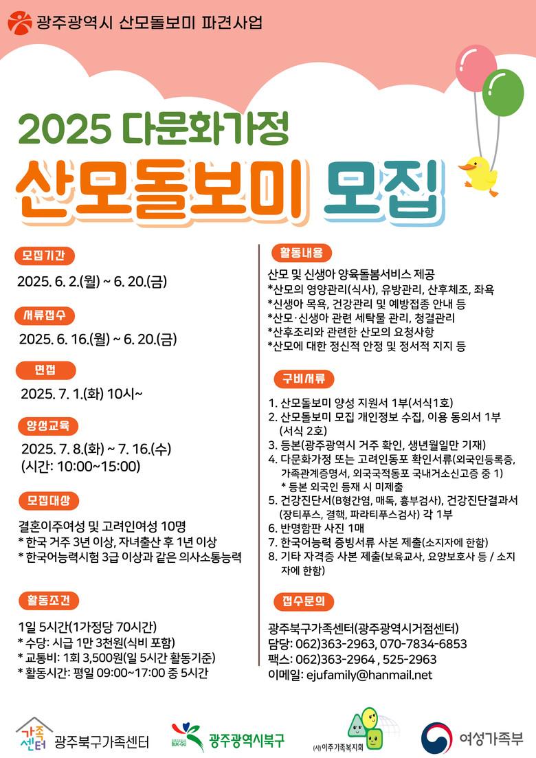 한편 산모돌보미 서비스 이용을 원하는 다문화가정 결혼이주여성 산모와 고려인여성 산모는 ‘다문화가정 산모돌보미 서비스 이용가정 모집’에 신청하면 된다. 광주북구가족센터 누리집을 통해 신청서 등을 내려받아 작성한 뒤 관련 서류와 함께 광주북구가족센터로 내방, 접수하면 된다. 연중 모집 중으로, 서비스 이용료는 무료다. 자세한 문의는 광주북구가족센터로 하면 된다.