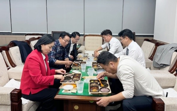 | ▲ 충남도의회 보건복지환경위원회 위원들이 지난 13일 야간까지 진행된 행정사무감사 일정으로 뒤늦은 도시락 저녁식사를 하고 있다. |
