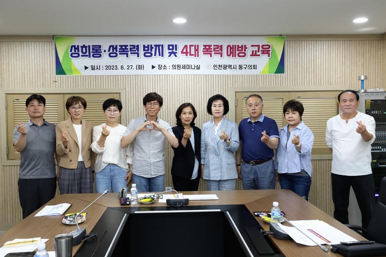 [동구 세계타임즈=심하린 기자] 인천 동구의회(의장 유옥분)는 27일 의원세미나실에서 동구의회 의원 및 의회사무과 직원들을 대상으로 4대 폭력(성희롱, 성매매, 성폭력, 가정폭력) 예방교육을 실시했다고 밝혔다.
