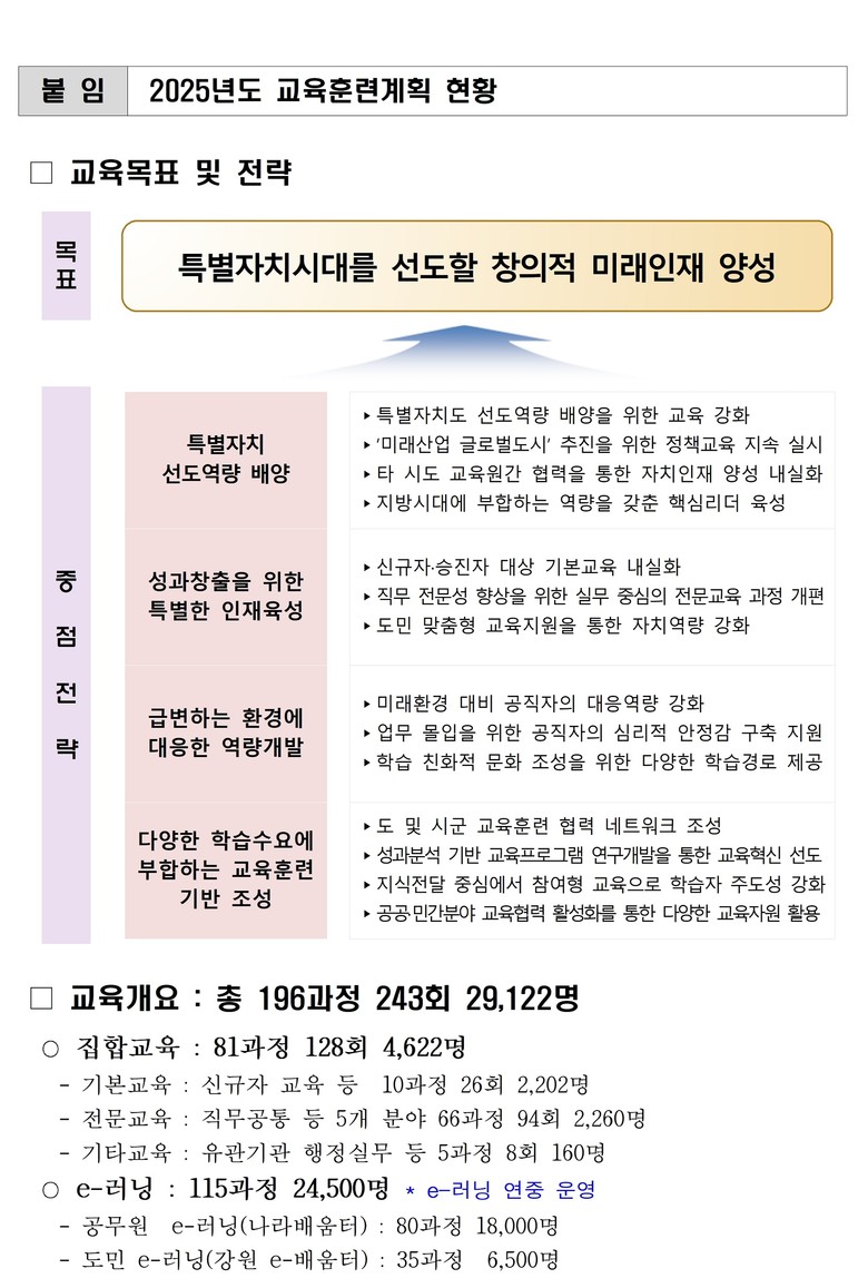 2025년도에는 ① 신규자 교육 체계 개편(기초 1주, 심화 3주), ② 리더십 과정 도·시군 교육 대상 분리, ③ 업무 몰입을 위한 공직자 심리적 안정감 지원 교육 신설, ④ 미래 환경 대비 공직자 대응 역량 과정 신설 및 개편 등 주요 변경 사항이 반영되었다.