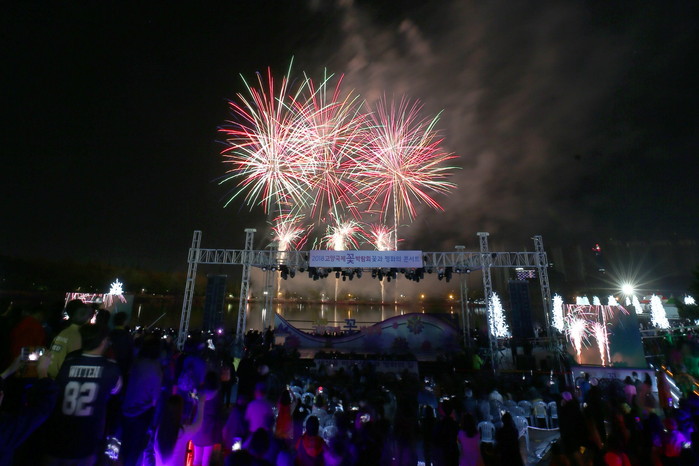 28일 고양시 호수공원에서는 2018고양국제꽃박람회 개막기념 콘서트가 성황리에 개최됐다. K-POP 가수들의 축하공연에 이어 밤하늘을 화려하게 수놓는 불꽃쇼가 성대하게 펼쳐졌다. 사진은 개막식 불꽃쇼가 펼쳐지고 있는 야간 꽃 박람회장 전경. 세계 꽃들의 눈부신 파노라마 2018고양국제꽃박람회는 5월 13일까지 개최된다.