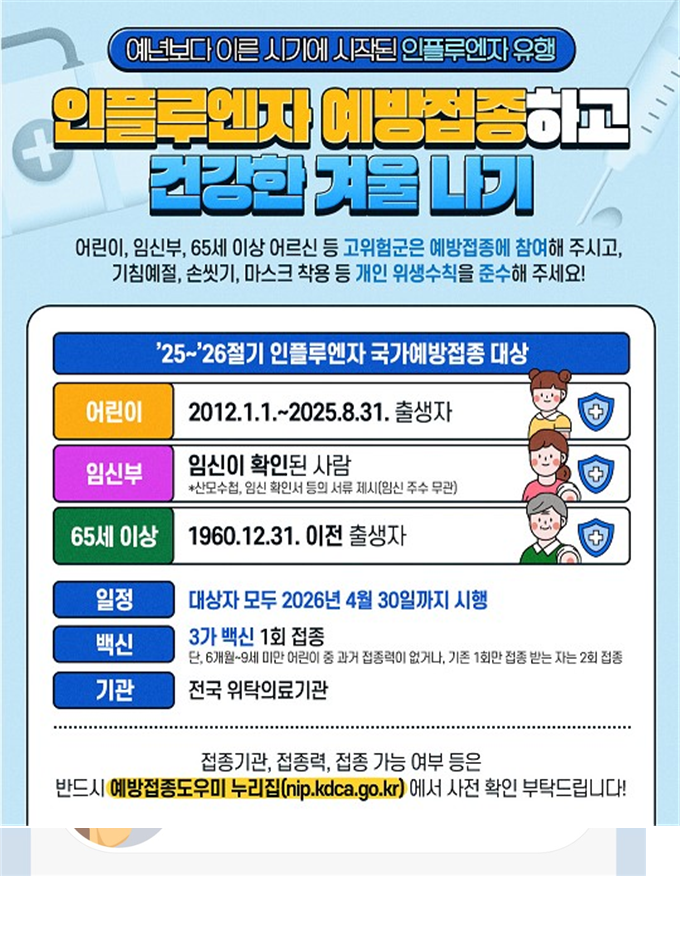 아울러 설 연휴 기간과 해외여행 전 65세 이상 어르신, 13세 이하 어린이, 임산부 등 고위험군은 인플루엔자 등 예방접종이 더욱 중요하며, 예방접종은 주소지와 관계없이 가까운 위탁의료기관에서 무료로 받을 수 있다.