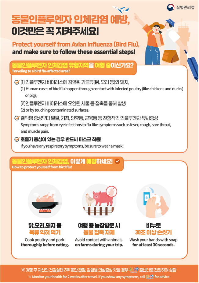 2월 10일부터 전국 공항만에서는 국내 입국하는 여행자를 대상으로 희망자에 한해 호흡기감염병 3종(동물인플루엔자 인체감염증, 코로나19, 인플루엔자) 검사*를 무료로 시행 중이다. 호흡기감염병 의심증상이 있는 해외여행객은 이를 적극 활용하는 것이 권장된다.