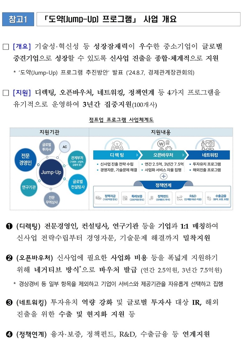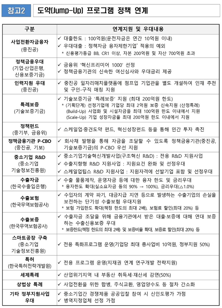 '도약(Jump-Up) 프로그램'은 우수한 성장성과 기술력을 갖춘 업력 7년 이상의 중소기업이 신사업·신시장 진출을 통해 새로운 성장동력을 확보하고 중견기업으로 도약할 수 있도록 지원하는 사업으로, 매년 100개사를 선정해 2029년까지 총 500개사를 육성할 계획이다.