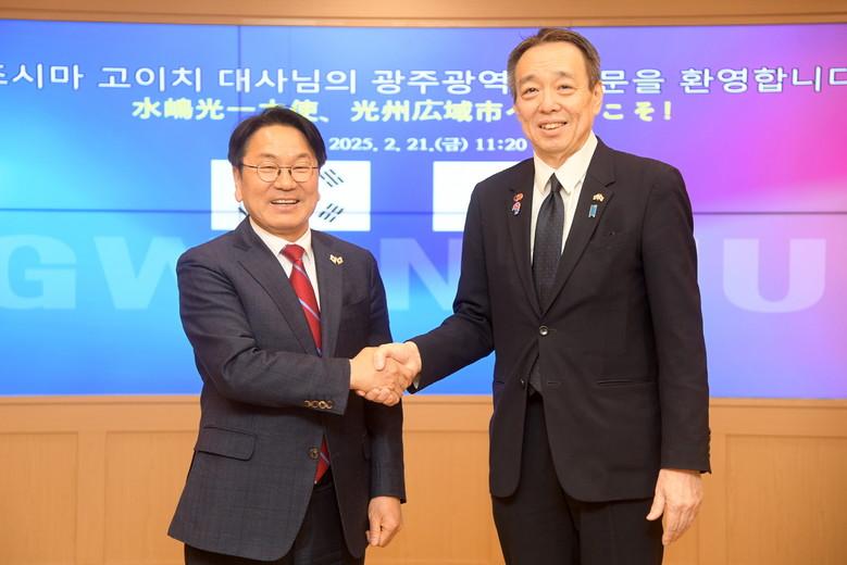 강기정 광주광역시장은 21일 시청 비즈니스룸에서 광주를 방문한 미즈시마 고이치 주한일본대사와 만나 양국의 경제‧산업‧문화 교류협력 활성화 방안에 대해 논의했다.