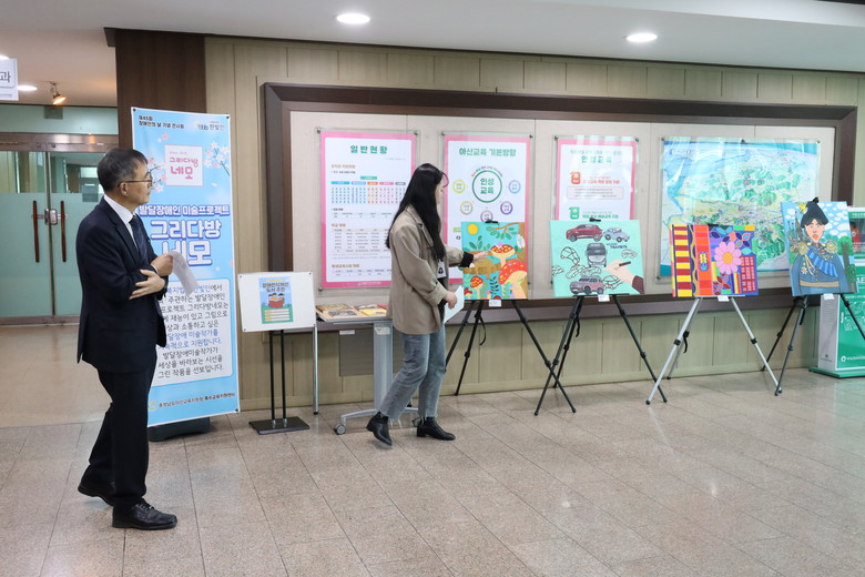 [아산시 세계타임즈=이현진 기자] 아산교육지원청(교육장 신세균)은 제45회 장애인의 날(4월 20일)을 맞이하여 발달장애인 미술작가들의 작품 4점을 전시하는 장애이해 공감 작품전을 진행한다. 이번 전시는 사회복지법인 한빛인이 주최·주관하는 발달장애인 미술 프로젝트 ‘그리다방네모’ 소속 작가들의 작품으로 구성되었으며, 4월 30일까지 진행된다.