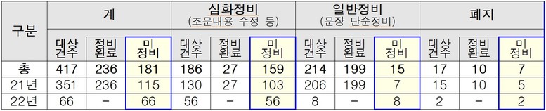 ※이행독려 : 평가대상 46건(‘21년 30, ’22년 16), 완료 13건(‘21년 13), 미정비 33건(’21년 17, ‘22년 16)
