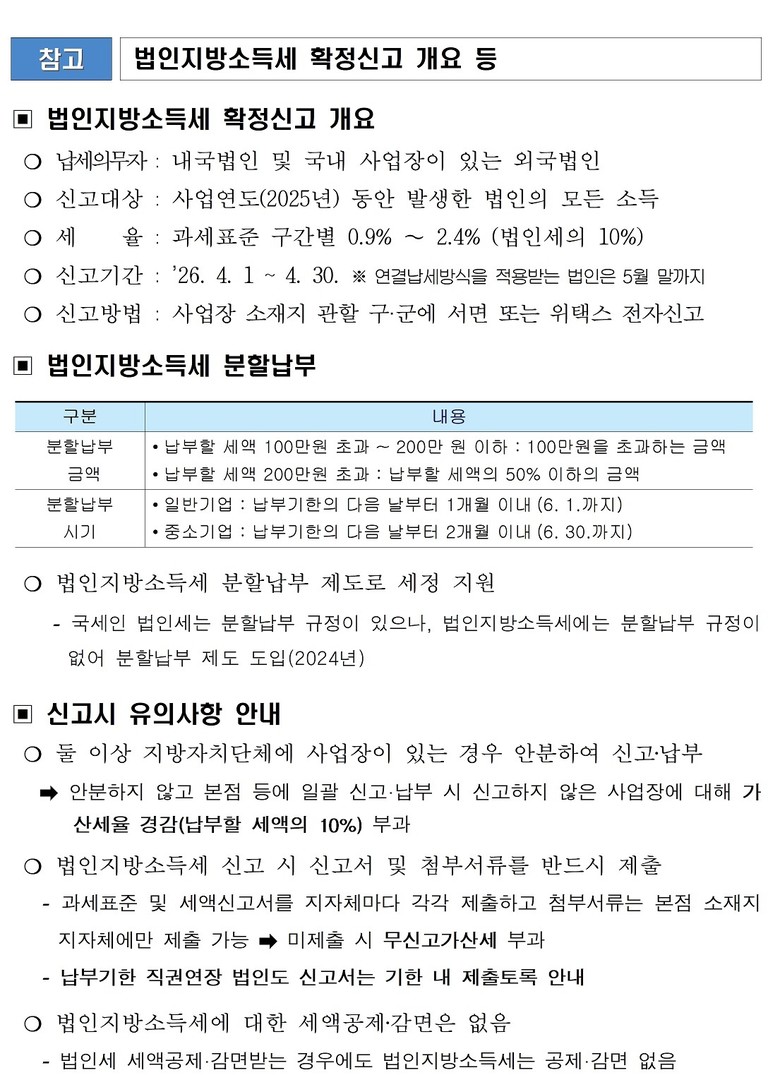 사업장별로 안분해 4월 30일까지 신고·납부하면 되고, 연결 납세 방식을 적용받는 법인은 5월 31일까지 신고·납부하면 된다.