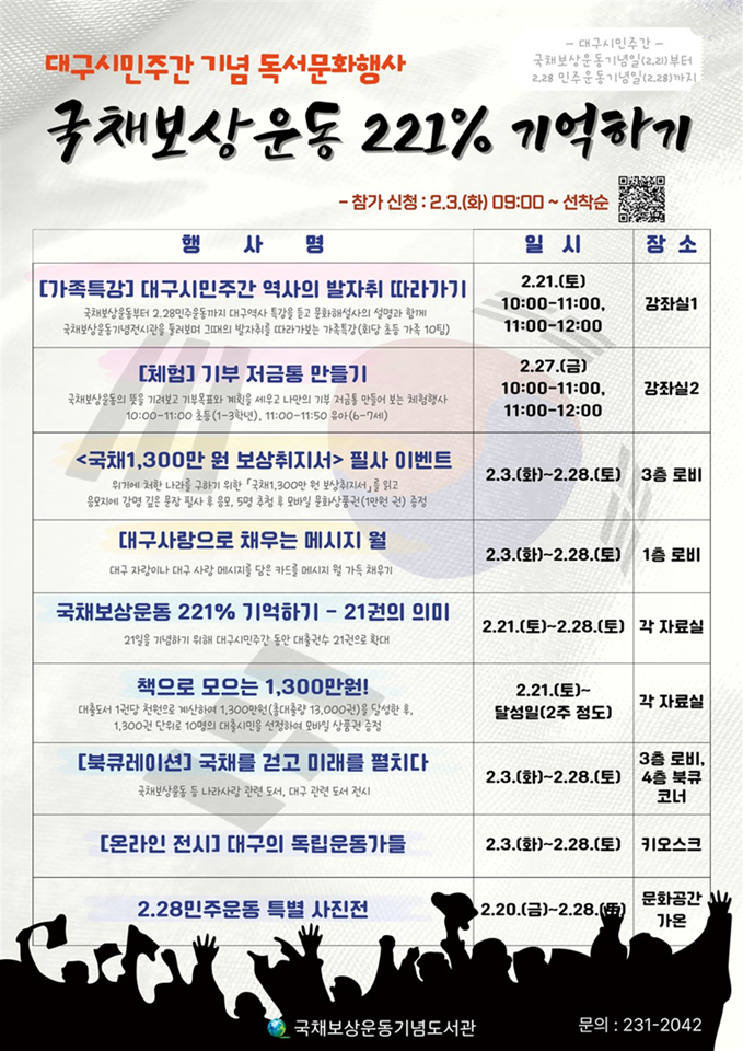 특히 ‘21일’을 기억하는 의미를 담아 대구시민주간 동안 도서 대출 권수를 21권으로 확대하는 ▲국채보상운동 221% 기억하기 – 21권의 의미 행사를 진행하고, 국채보상 시민 북챌린지로 ▲책으로 모으는 1,300만 원! 이벤트를 통해 13,000권 도서 대출을 달성한 후, 1,300권 단위로 해당 대출자에게 상품권을 증정한다.