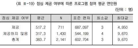 강 의원은 부산복지개발원의 연구결과에서 점심을 제공하지 않는 경로당의 프로그램 참여 연평균 인원은 317명인 반면, 점심을 제공하는 경로당의 프로그램 연평균 참여인원은 517명으로 점심제공 경로당이 미제공 경로당 대비 163%나 많은 인원이 프로그램에 참여하는 결과를 보이고 있다고 밝혔다.(표III-19 참조)