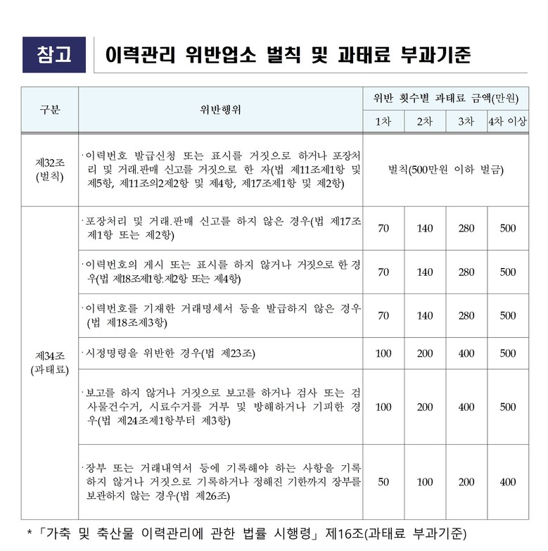 주요 점검 내용은 △이력번호 미기재 및 허위기재 여부 △거래신고 이행 여부 △축산물 등급 및 원산지 표시의 적정 여부 등으로, 관련 법령 위반 시 과태료 부과 등 엄정한 행정조치가 이뤄질 방침이다.