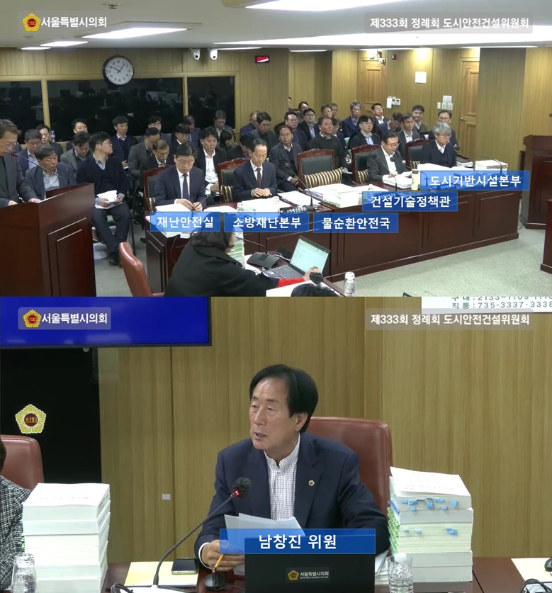 남창진 의원은 재난안전실을 대상으로 한 질의에서 「재난 및 안전관리 기본법」의 자연재난 17개, 사회재난 10개 등 재난 유형은 계속 늘어나고 있고 서울시도 발생하는 재난 유형에 따라 조직과 인력을 변화시키고 대응하고 있지만 변화 속도를 따라가지 못하고 있다며 업무 공백 우려를 표했다.