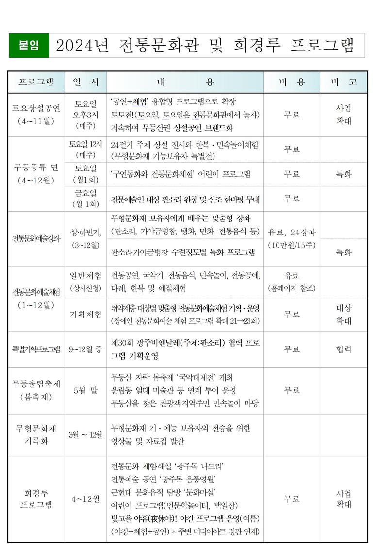 - 무등산권 토요상설공연 브랜드화·야간 체험 프로그램 등 운영