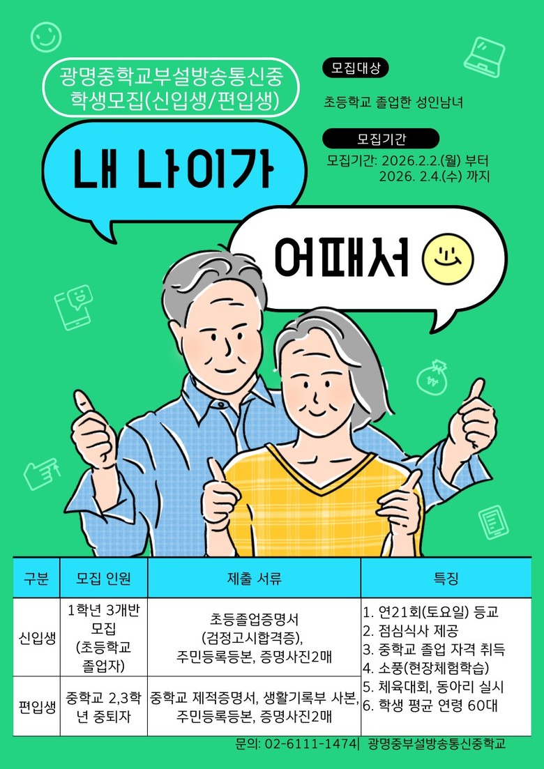 ◦ 신입생 및 편입생 모집은 2026년 2월 2일(월)부터 2월 4일(수)까지 [광명시 세계타임즈=송민수 기자] 광명중학교 부설 방송통신중학교(교장 신동훈)는 2026학년도 신입생 및 편입생 모집을 2026년 2월 2일(월)부터 2월 4일(수)까지 진행한다.