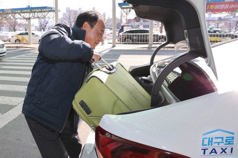 | ▲ < 2023. 3. 3.(금) 이만규 대구시의회 의장 대구로택시 일일기사 체험 > - 대구국제공항에서 승객을 도와 짐을 트렁크에 싣는 모습 |