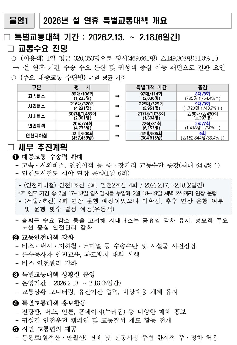 - 상황실 운영·교통안전 강화로 연휴 기간 시민 불편 최소화 - [인천 세계타임즈=심하린 기자] 인천광역시(시장 유정복)는 설 연휴 기간 시민들이 안심하고 이동할 수 있도록 오는 2월 13일부터 18일까지 6일간을 ‘설 연휴 특별교통대책 기간’으로 정하고, 관계기관과 함께 ‘2026년 설 연휴 특별교통대책’을 본격 시행한다고 밝혔다.