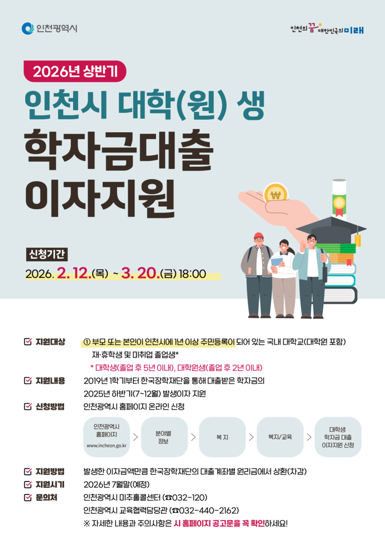 신청 기간은 2026년 2월 12일 오전 9시부터 3월 20일 오후 6시까지이며, 인천시 누리집(www.incheon.go.kr) 내 ‘학자금대출 이자 지원 신청’ 게시판을 통해 구비서류를 첨부해 온라인으로 신청하면 된다.