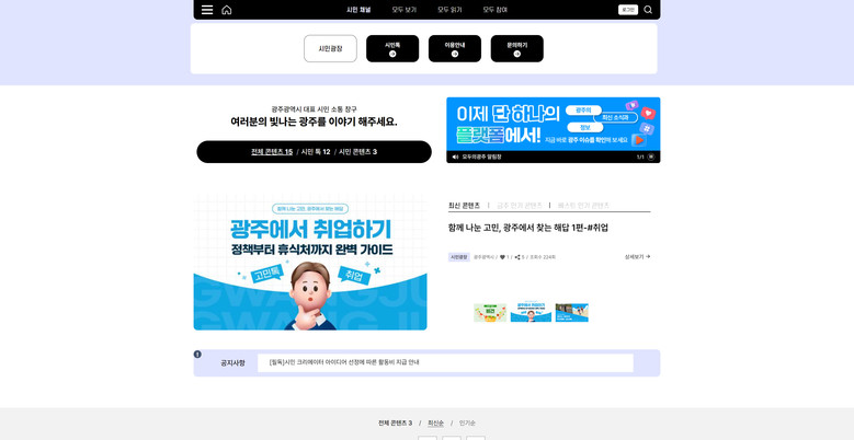 ‘시민채널’은 광주시민이 광주의 다양한 정보를 공유하고 홍보콘텐츠를 제안하는 ‘시민톡’과 시민이 제안한 아이디어를 제작한 시민콘텐츠를 담은 ‘시민광장’으로 구성됐다.