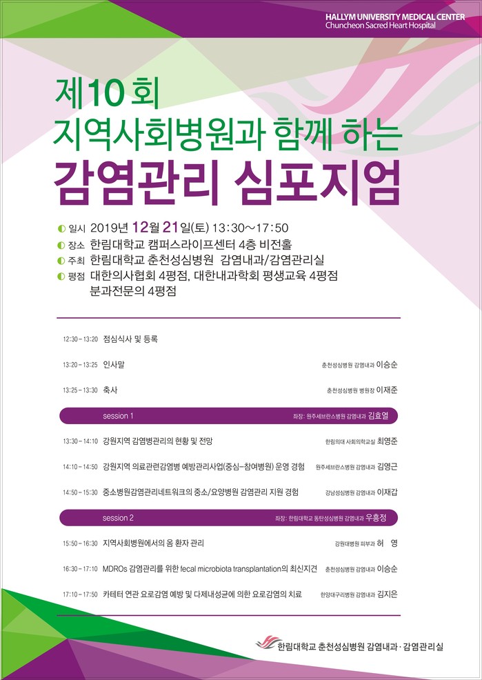 이승순 한림대춘천성심병원 감염내과 교수는 “지역사회 급성기 병원과 장기요양시설간 환자 이동이 잦아지면서 다제내성균이나 기타 감염질환의 전파 위험이 증가하고 있다”면서 “이번 심포지엄은 지역사회 감염병 관리의 현주소와 미래, 최근 주목받고 있는 다제내성균 탈집락의 최신 지견, 노인인구가 많은 강원지역에서 흔히 볼 수 있는 옴환자 관리와 카테터 연관 요로감염의 예방 및 치료에 대해 배우고 정보를 교류하는 시간이 될 것이다”고 말했다.