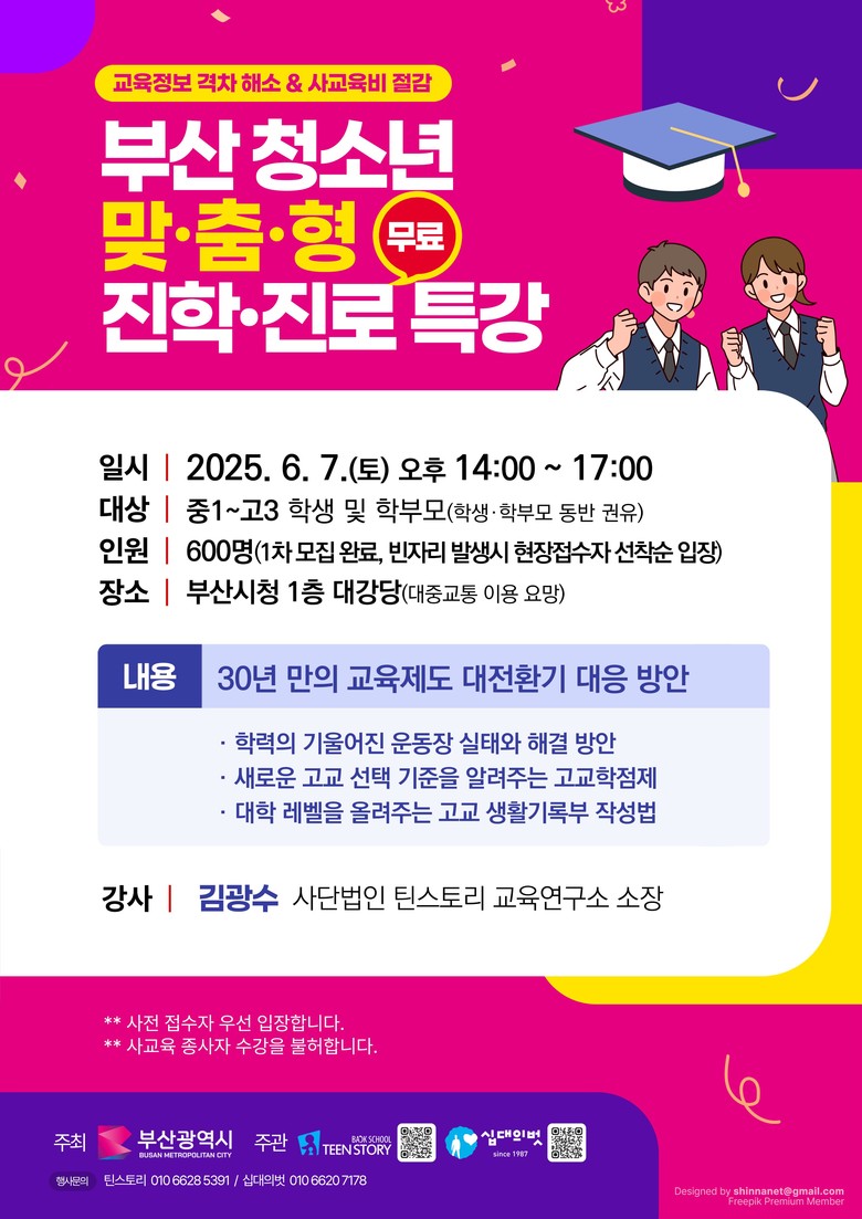 강사는 부산에서 오랜 기간 수도권과 지방의 교육정보 격차 해소 방안을 연구하면서 청소년 무료 진학·진로 컨설팅과 무료 입시설명회 개최 등을 하고 있는 김광수 (사)틴스토리 교육연구소 소장이다.