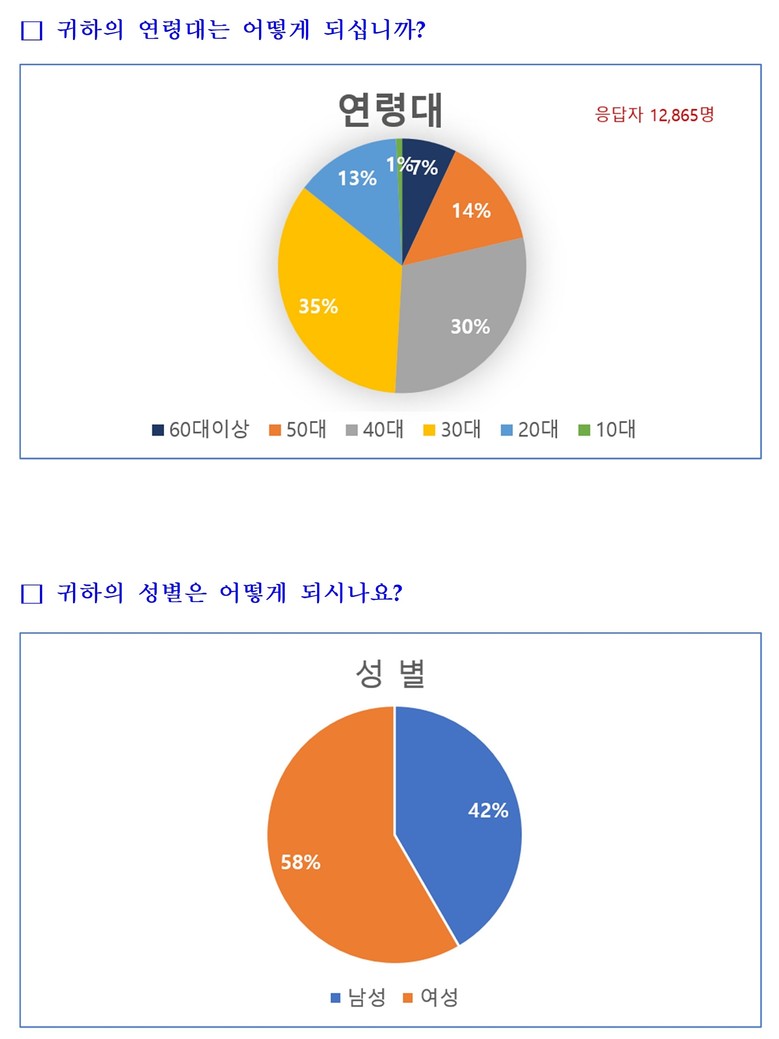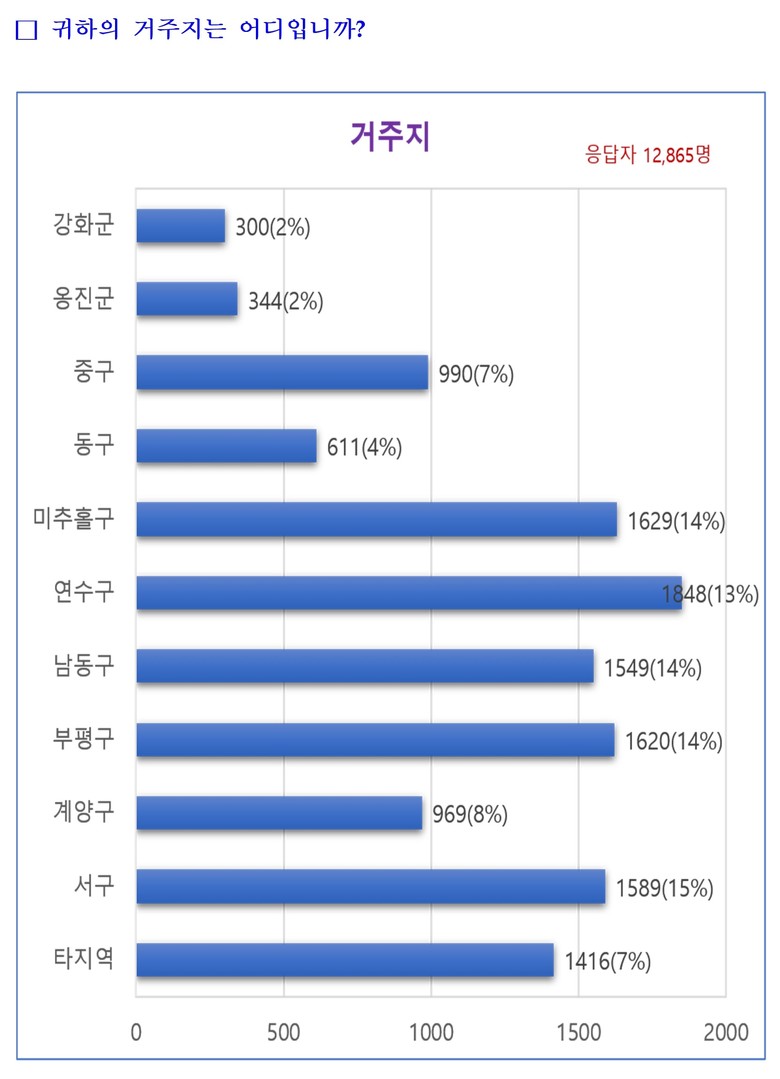 이번 조사는 인천시 누리집을 통해 진행됐으며 총 12,865명이 참여했다. 응답자 중 인천시민은 89%(11,449명), 타지역 거주자는 11%(1,416명)였으며, 연령대별로는 30대(35%)와 40대(30%)의 참여 비중이 높았다.