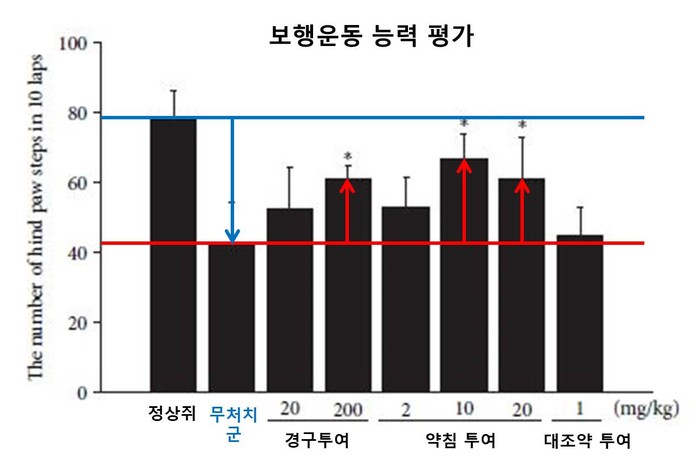 연구팀은 쥐의 보행운동 능력과 감각 능력을 각각 쳇바퀴 운동과 전열기(hot plate) 테스트로 평가했다. 실험 쥐의 보행운동 능력은 쳇바퀴 테스트 중 뒷발 걸음 수로 계산했다. 연구팀에 따르면 정상 쥐는 78.3±8.2 걸음으로 쳇바퀴를 걸었지만, 척추관협착증을 유도한 쥐의 걸음 수는 유의하게 감소했다. '신바로2'를 투여한 쥐는 척추관협착증 유도 후 7일째에 운동 기능이 빠르게 향상됐다.