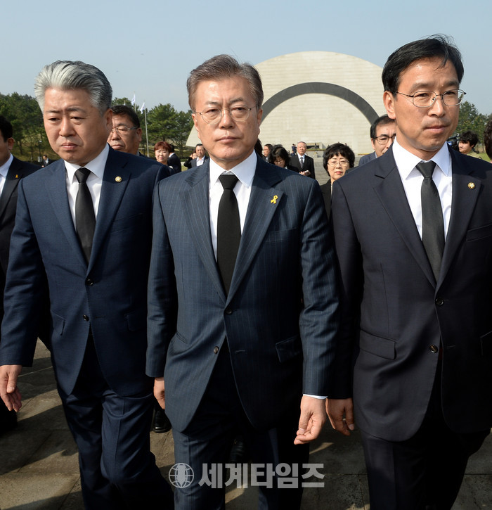 문재인 더불어민주당 대선후보가 18일 오전 제주특별자치도 제주시 명림로에 위치한 제주 4.3평화공원 위령탑에 유가족과 함께 헌화 참배한 후 위렵탑을 떠나고 있다. 문 후보는 방명록에 '4.3제주가 외롭지 않게 제주의 언덕이 되겠습니다'라고 작성했다.2017.04.18.