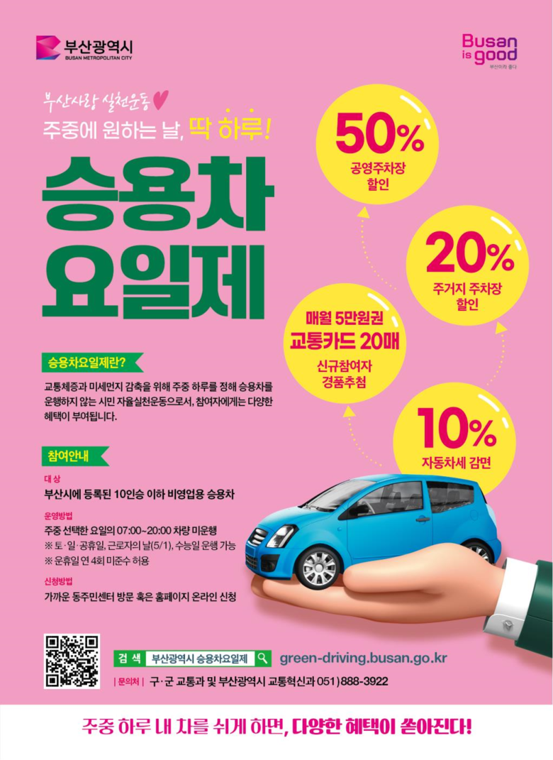 자세한 사항은 승용차요일제 누리집(green-driving.busan.go.kr)을 참조하면 된다.